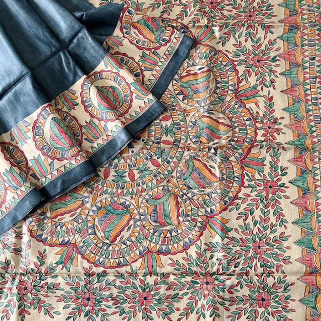The hand-printed Kalamkari in Madhubani Pure Ghicha Tussar saree